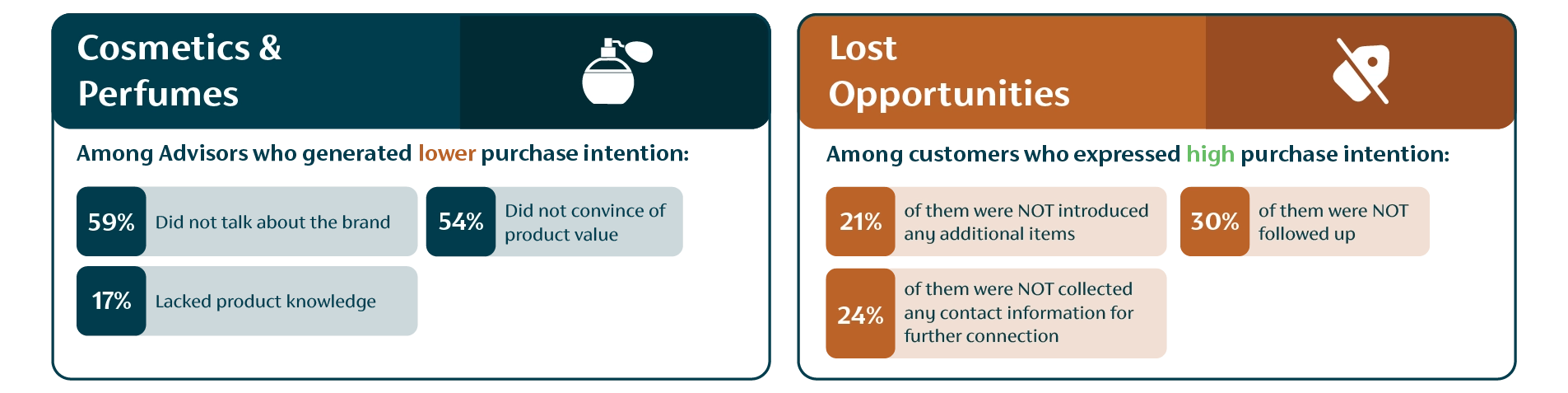 - Cosmetics & Perfumes, at 41% (–8pp), represents the greatest upside potential.