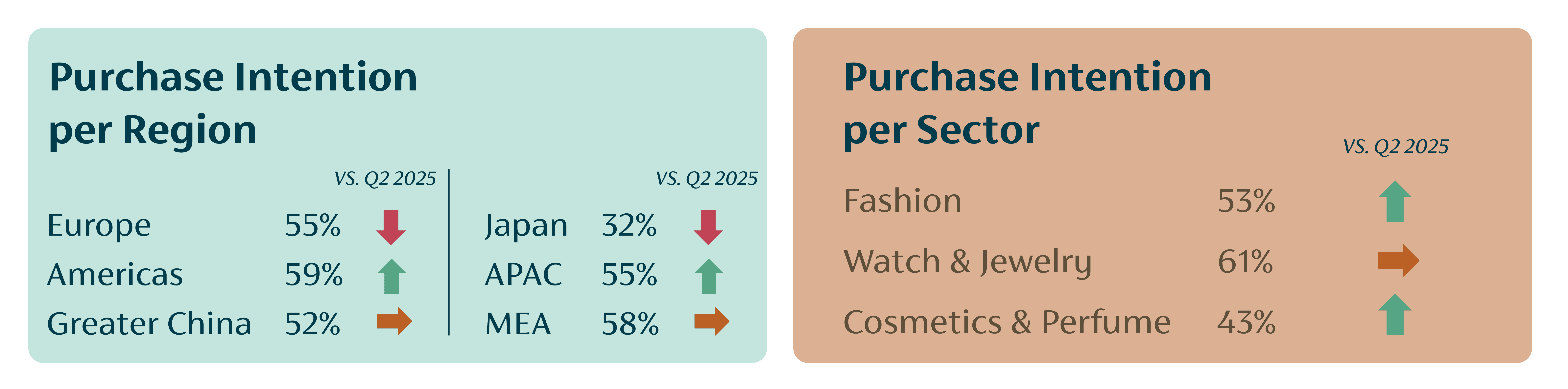 When compared to Q2 2025, regional divergences have become increasingly visible. Among all major luxury markets, Japan and Europe are the only two regions showing a decline in purchase intention quarter-on-quarter.